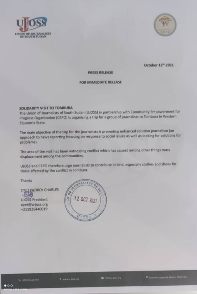 UJOSS launches Tombura Solidarity VisitujossOctober 12, 2021Update UJOSS announces solidarity visit to Tombura, Western Equatoria State.
