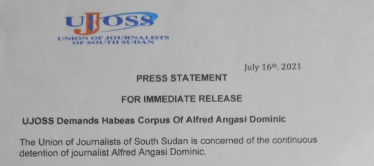 FOR IMMEDIATE RELEASE UJOSS Demands Habeas Corpus Of Alfred Angasi Dominic The Union of Journalists of South Sudan is concerned of the continuous detention of journalist Alfred Angasi Dominic. Angasi, who works at South Sudan Broadcasting Corporation as a Newsreader…